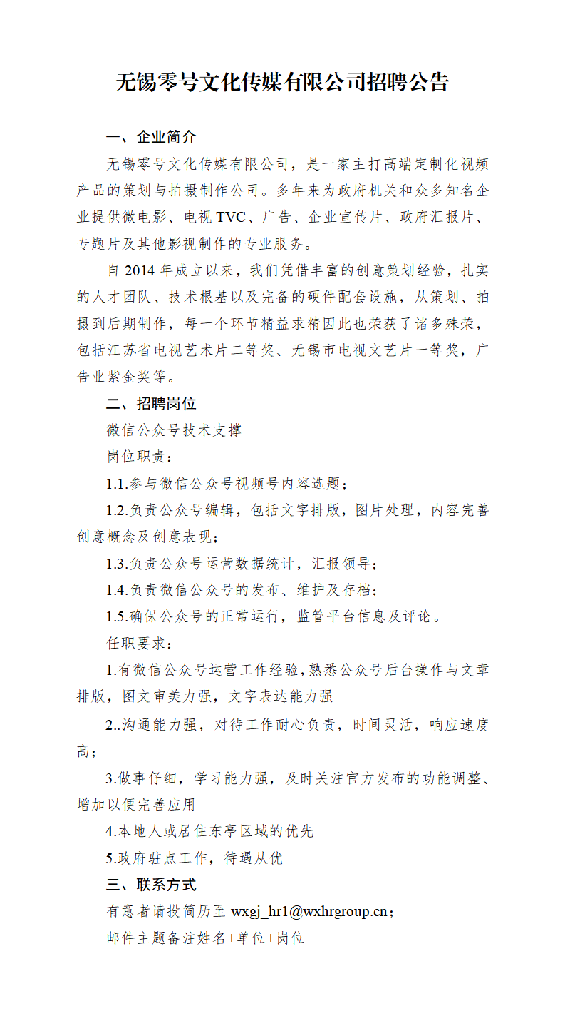 無(wú)錫零號(hào)文化傳媒有限公司2023年招聘公告