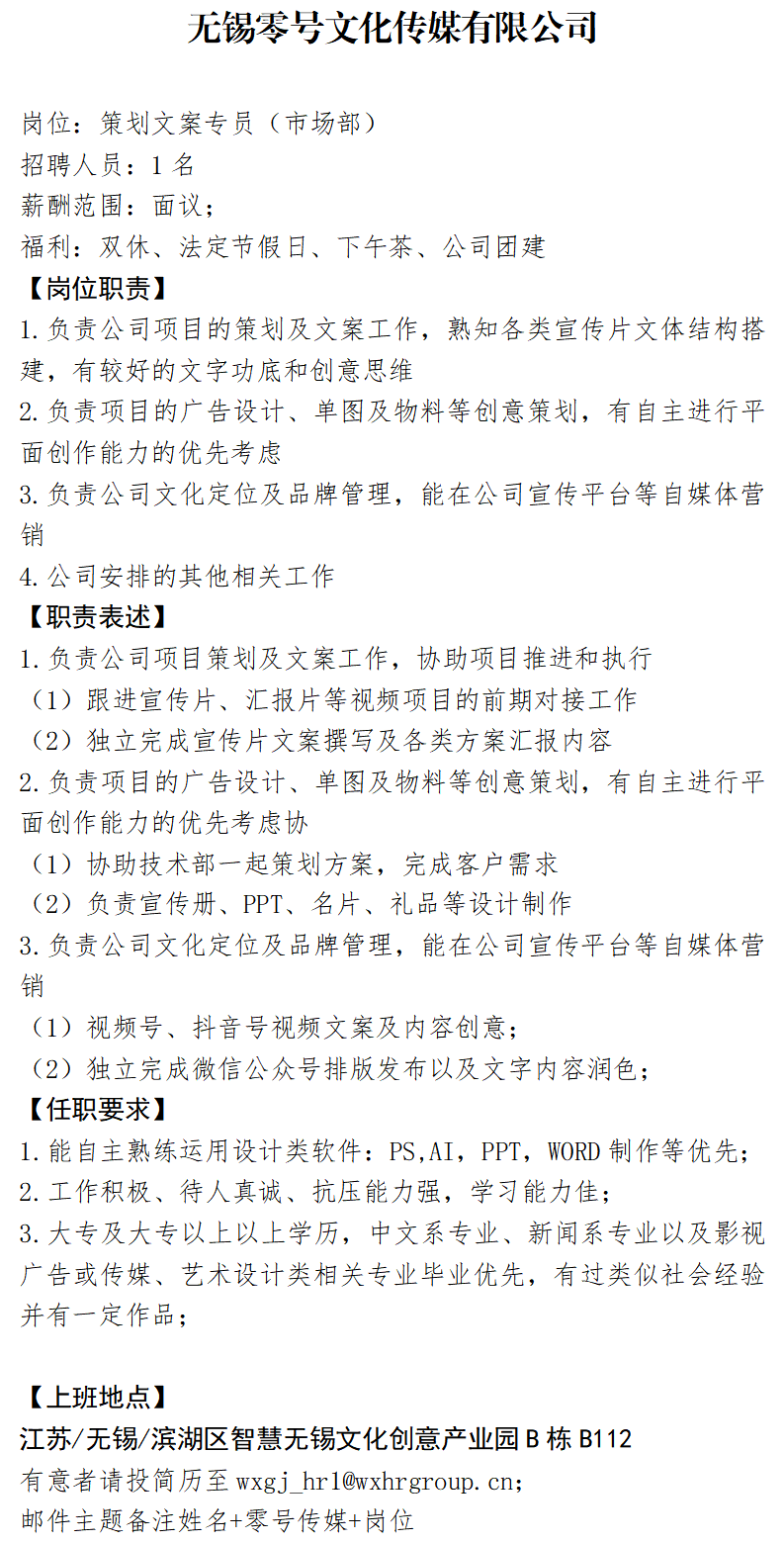無(wú)錫零號(hào)文化傳媒有限公司2023年招聘公告