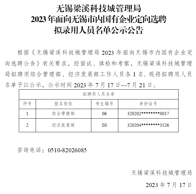 無錫梁溪科技城管理局2023年面向無錫市內(nèi)國有企業(yè)定向選聘擬錄用人員名單公示公告