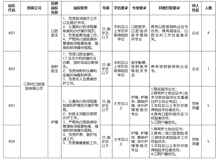 江陰公用事業(yè)集團(tuán)有限公司是江陰市屬?lài)?guó)有企業(yè),集團(tuán)下轄子公司江陰口腔醫(yī)院因業(yè)務(wù)發(fā)展需要,委托第三方面向社會(huì)公開(kāi)招聘工作人員15名。江陰口腔醫(yī)院,前身是江陰市衛(wèi)生職工中等專(zhuān)業(yè)學(xué)校口腔門(mén)診部,始建于1985年,是在江陰市口腔病防治所的基礎(chǔ)上成立的國(guó)有二級(jí)口腔專(zhuān)科醫(yī)院,是無(wú)錫市口腔醫(yī)學(xué)會(huì)副會(huì)長(zhǎng)單位、江陰市醫(yī)學(xué)會(huì)口腔醫(yī)學(xué)分會(huì)主任委員單位、江陰市口腔質(zhì)控中心掛靠單位,現(xiàn)發(fā)展為一所集醫(yī)療、教學(xué)、科研、預(yù)防、保健為一體的國(guó)有二級(jí)口腔專(zhuān)科醫(yī)院、口腔醫(yī)學(xué)教學(xué)科研中心?,F(xiàn)將有關(guān)事項(xiàng)公告如下: